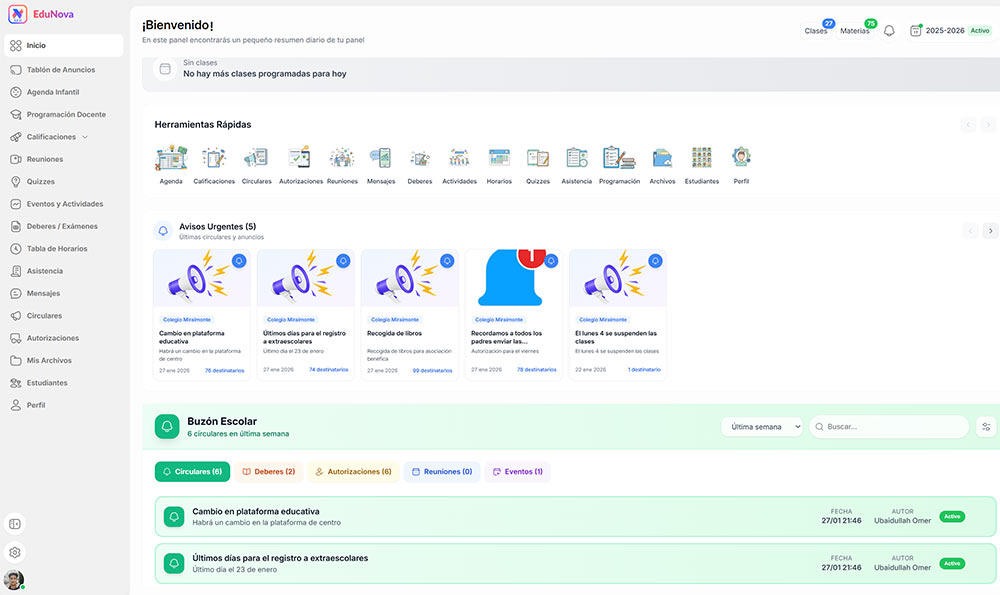 EduNova se adapta a cada usuario. Explora las funcionalidades para docentes, centro, familias y alumnado.